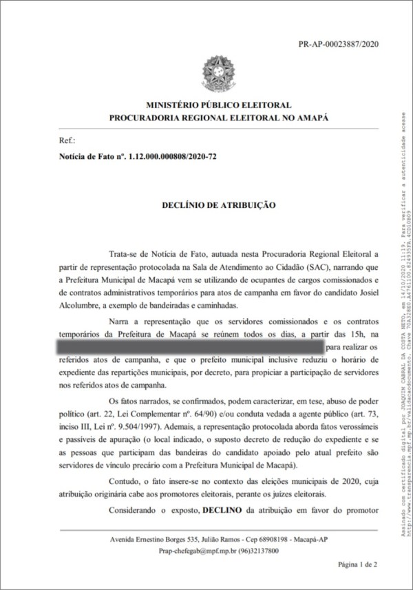O procurador do Ministério Público Federal, Joaquim Cabral da Costa Neto, encaminhou na última quarta-feira, 14, documento ao promotor eleitoral da 2ª Zona Eleitoral para que investigue denúncia de que a Prefeitura Municipal de Macapá vem se utilizando de ocupantes de cargos comissionados e de contratos administrativos temporários para atos de campanha em favor do... Continuar Lendo →