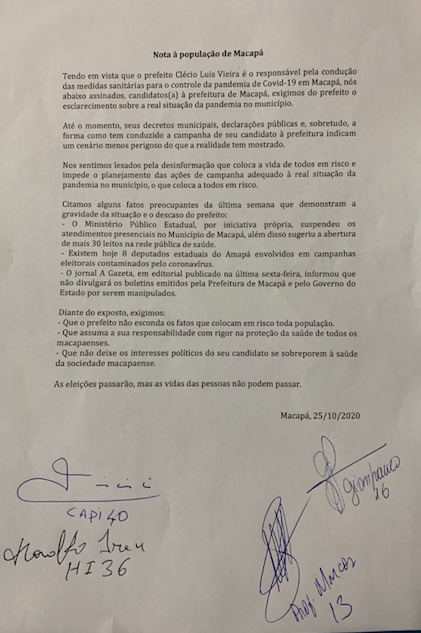 Outro alerta foi feito por uma Nota à População de Macapá, onde os candidatos Marcos Roberto, Gianfranco, Capi e Haroldo Iran assinaram documento chamado “Nota à população” cobrando esclarecimentos do prefeito Clécio com relação a real situação da pandemia na Capital.