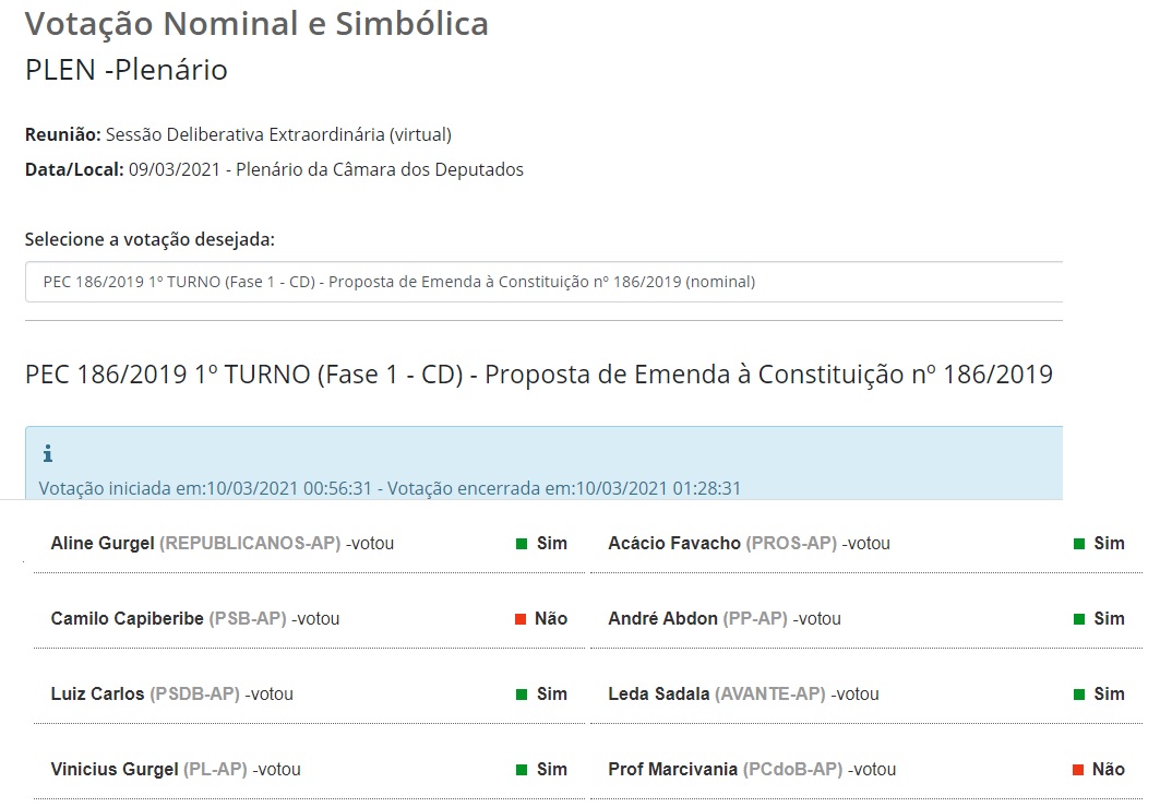 6 dos 8 deputados federais do AP votaram a favor do texto original da Proposta de Emenda à Constituição (PEC) 186/2019 que está em análise em 1º turno na Câmara dos Deputados, nesta segunda e terça-feiras (9 e 10): Acácio Favacho, Aline Gurgel, André Abdon, Leda Sadala, Luiz Carlos e Vinicius Gurgel votaram para impedir o reajuste e a progressão na carreira e a contratação de servidores, mesmo durante a pandemia, para não contratar novos leitos de UTI-Covid, cortar investimentos na educação e na saúde. Apenas os deputados Camilo Capiberibe e Professora Marcivânia votaram a favor dos servidores e para o fortalecimento dos serviços públicos durante a pandemia e nas crises fiscais.