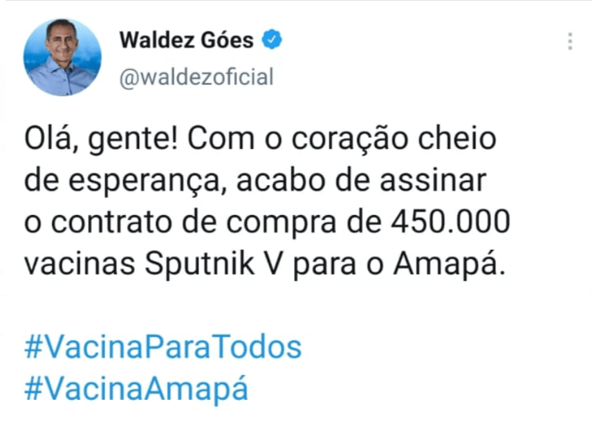 Em um vídeo anunciando a compra, Góes escreveu: “Com o coração cheio de esperança, acabo de assinar o contrato de compra de 450.000 vacinas Sputnik V para o Amapá”.